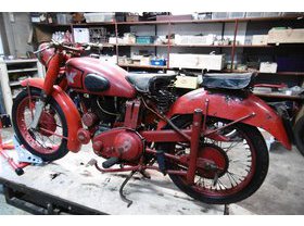 MATCHLESS G3 de 1941, moto militaire reconditionnée en Italie avec une suspension arrière breveté Benelli, phare, boite à outils, garde boue arrière, feu plaque arrière origine Moto Guzzi, machine dans son jus, non collée avec CG, une moto que l'on voulait garder, mais manque de temps.