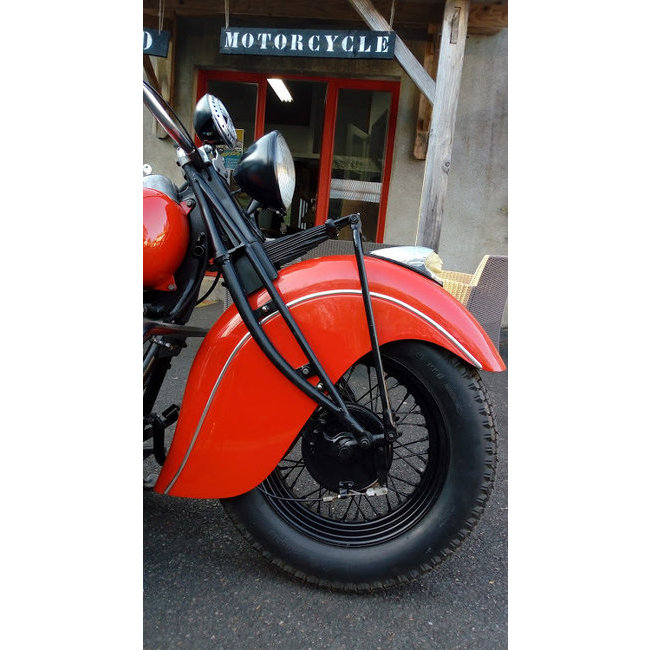 Full restauration pour cette rare Indian 1940 avec tous les éléments d'époque (pas de refabrication) comme le klaxon, la tête d'indien veilleuse, compteur, feu arrière en verre etc.