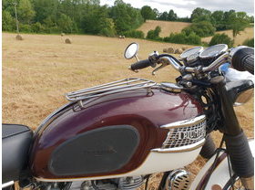 La monte d'un reservoir d'un millésime de 1966 avec grille de réservoir et logos harmonica ainsi qu'une couleur du plus belle effet en fait une moto particulièrement élégante.